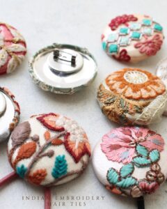 ばぐるちゅでは、インド刺繍リボンの端きれを使って、ブローチやヘアゴムを作っています。