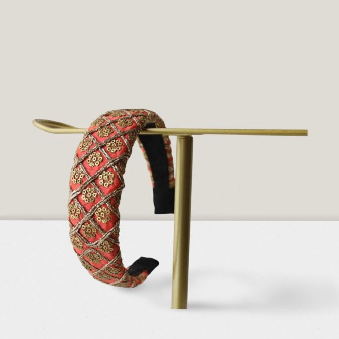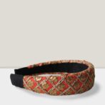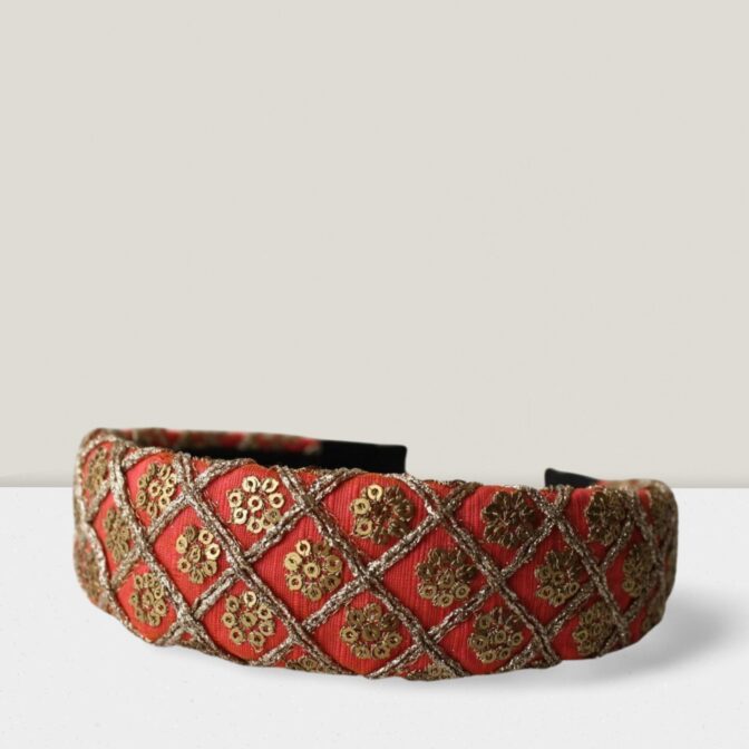 伝統的なインドの工芸品である刺繍リボンを贅沢にあしらった、きらめく大人のカチューシャ。