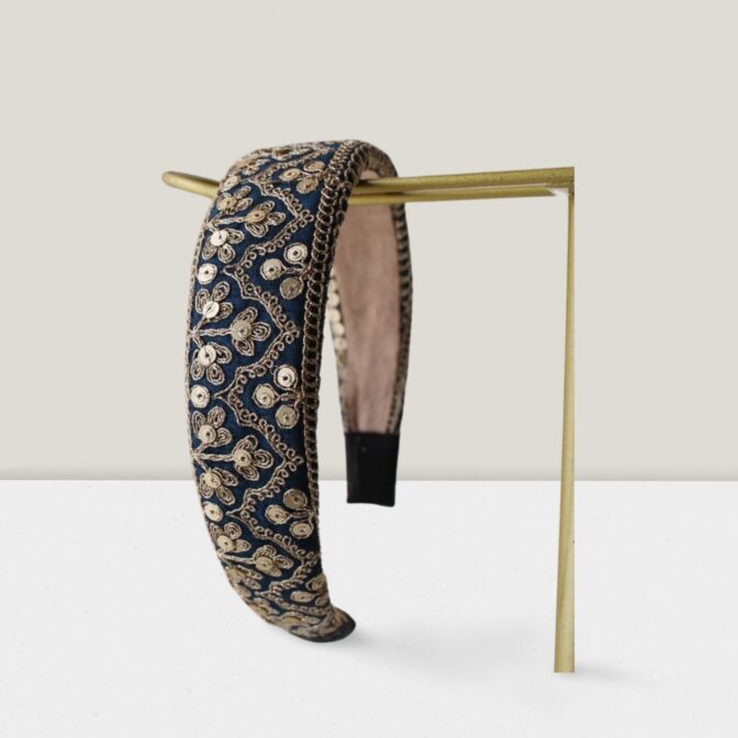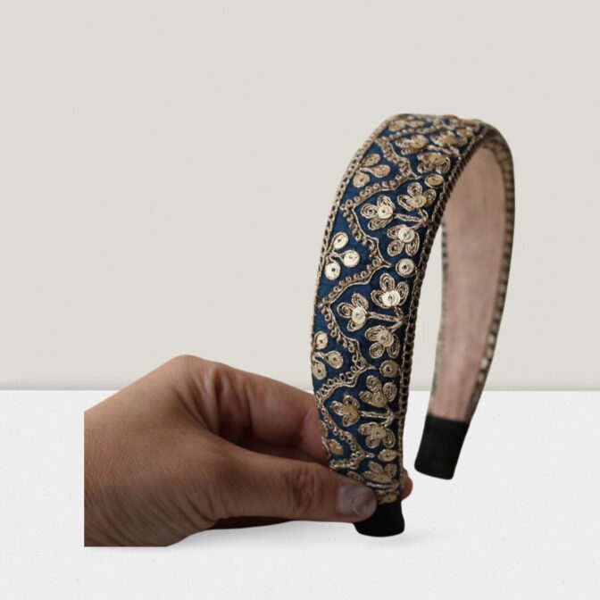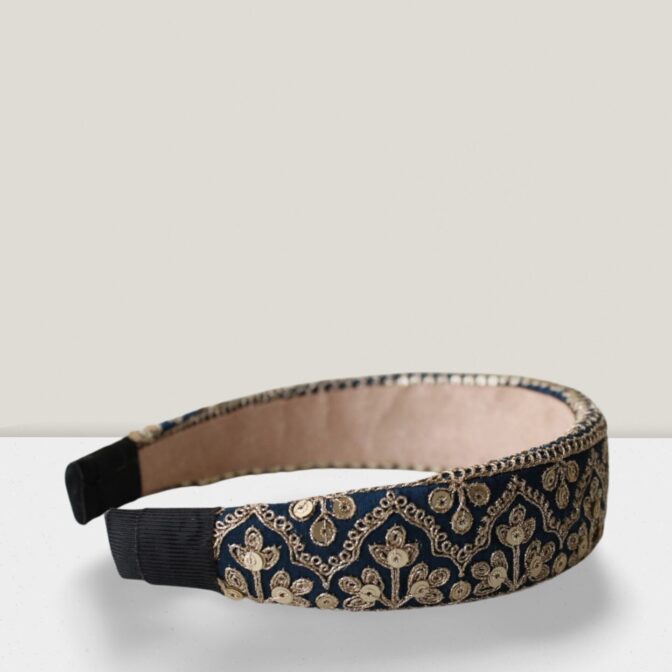 伝統的なインドの工芸品である刺繍リボンを贅沢にあしらった、きらめく大人のカチューシャ。